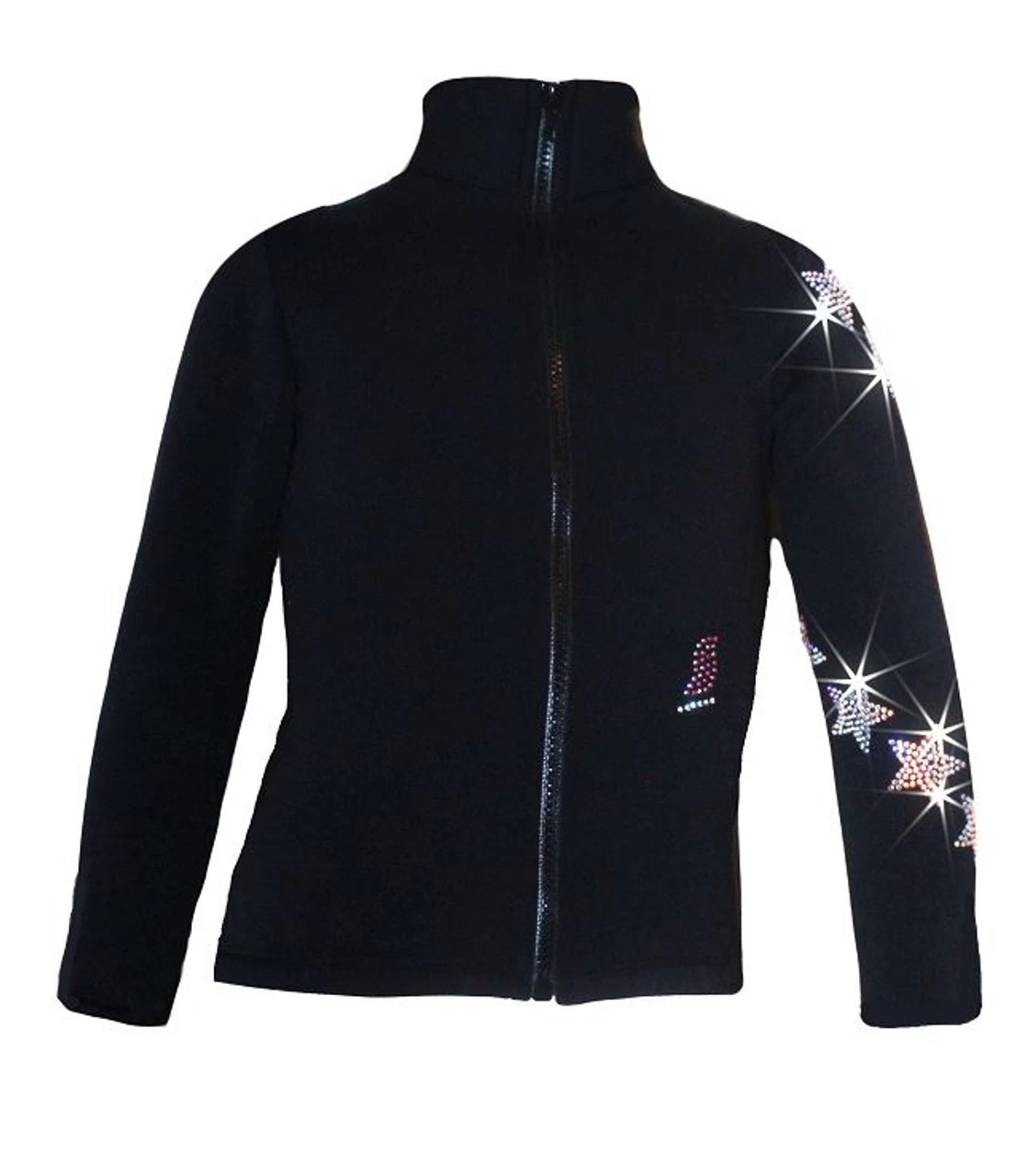 Sparkly AB clear rhinestones sparkles around the left sleeve of the jackets in “Spiral Stars” pattern. Featuring over 800 rhinestones, Polartec power stretch fabric and fitted style that perfect for ice skaters. Enjoy skating and look great on the ice with premium ice skating jacket by Ice Fire – your way to shine!