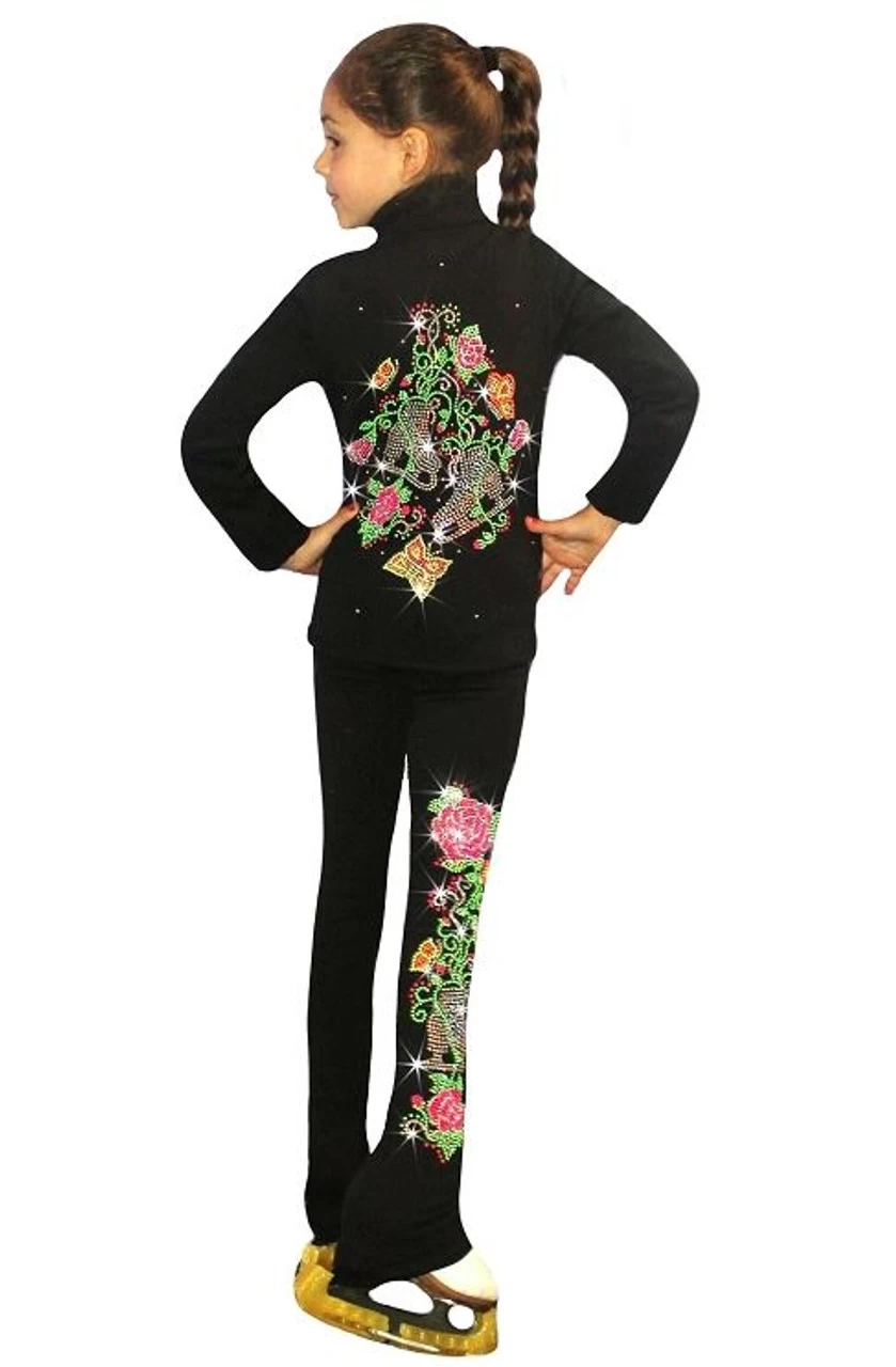 Polartec power stretch ice skating jacket. Fitted style without the hood provide comfort and neat look on the ice. Featuring bright neon rhinestuds and sparkly rhinestones “Summer Skates” design on the back of the jacket. Butterfly’s and roses swirls around the pair of skates making this design look spectacular on the ice. Stay warm and look cool in this new dazzling design from IceFireSkateWear.com. Available in girls and women sizes. Please, see matching pants to complete your outfit.