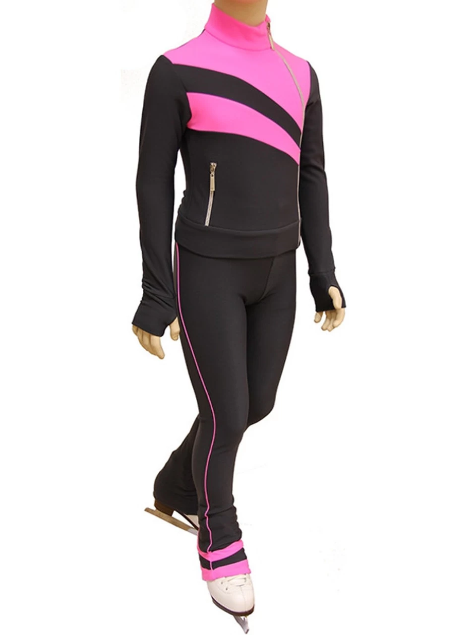 Training Pants “Rays” for figure skating is made of Vuelta The kit includes jacket and pants. Jacket features asymmetrical panels and a zip closure, which is an interesting element of decor and unusual design solution. Cuff – gloves, stand – up collar. Pants are also asymmetrical and decorated with stripes – piping and curved panels of fabric of a different color. Vuelta – the warm, soft, fastness fabric with inner fleece and a beautiful tension in all directions. Excellent thermal insulation properties, optimum breathability and antibacterial treatment that prevents the spread of germs, make this costume out of fabric Vuelta for guests.