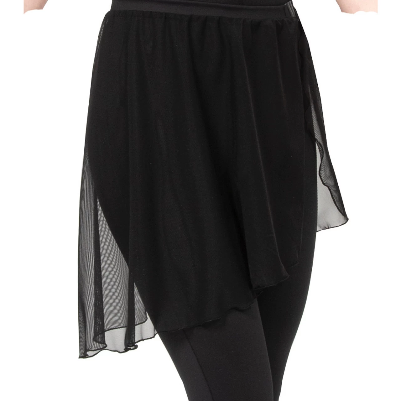 A sheer black mesh layer perfect for wearing with a bodysuit, 1-piece or leggings. This style features a lycra band with a clip closure and angled hem.