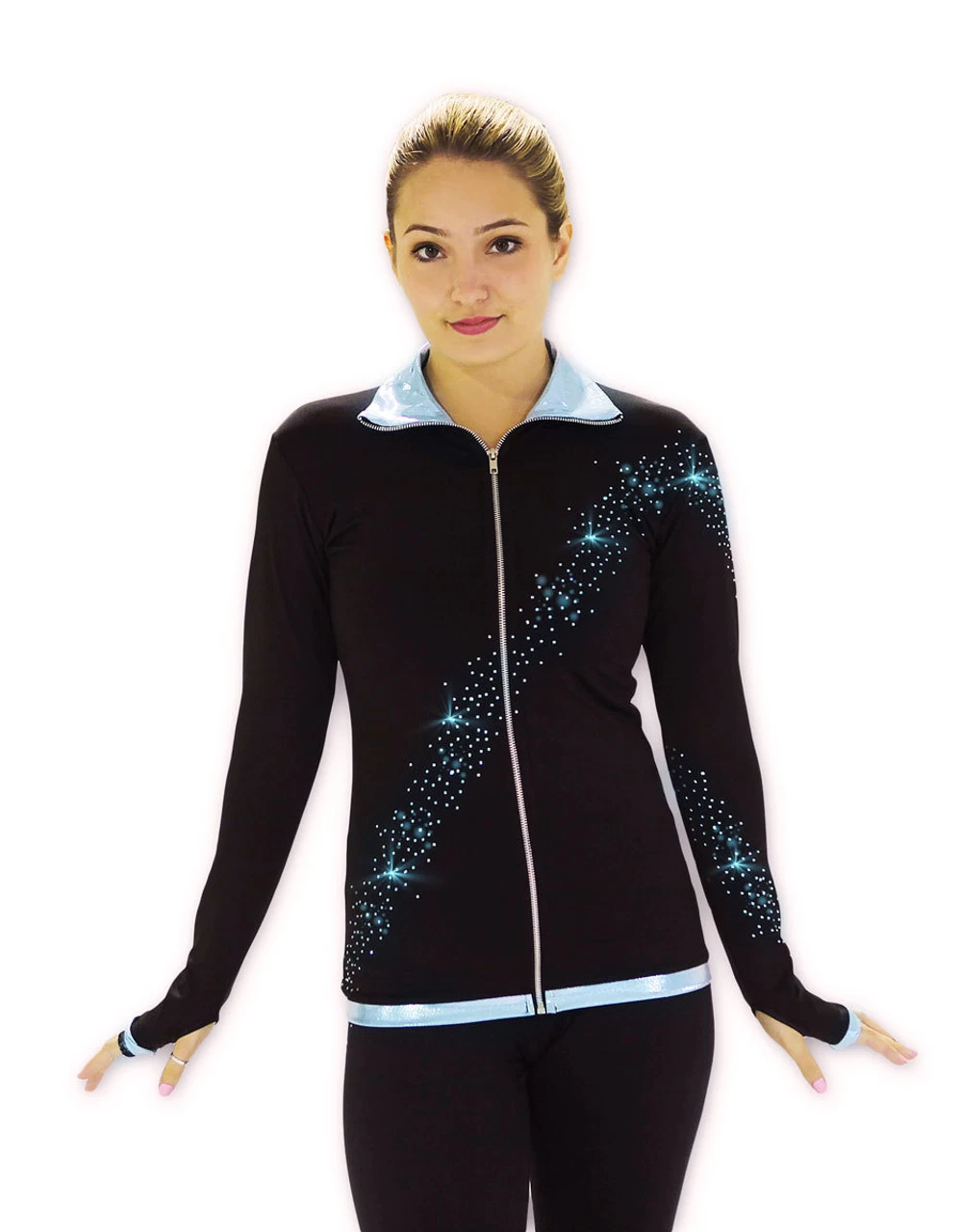 This beautiful jacket is made from supplex four way stretch material. It is decorated by crystal in a spiral like design that took the ice skating fashion by storm. Purple trim makes the jacket really pop when you hit the ice. Extremely comfortable to skate in and a great fashion statement. The sleeves come with a thumb loop for when you don’t want to wear gloves and need extra protection.