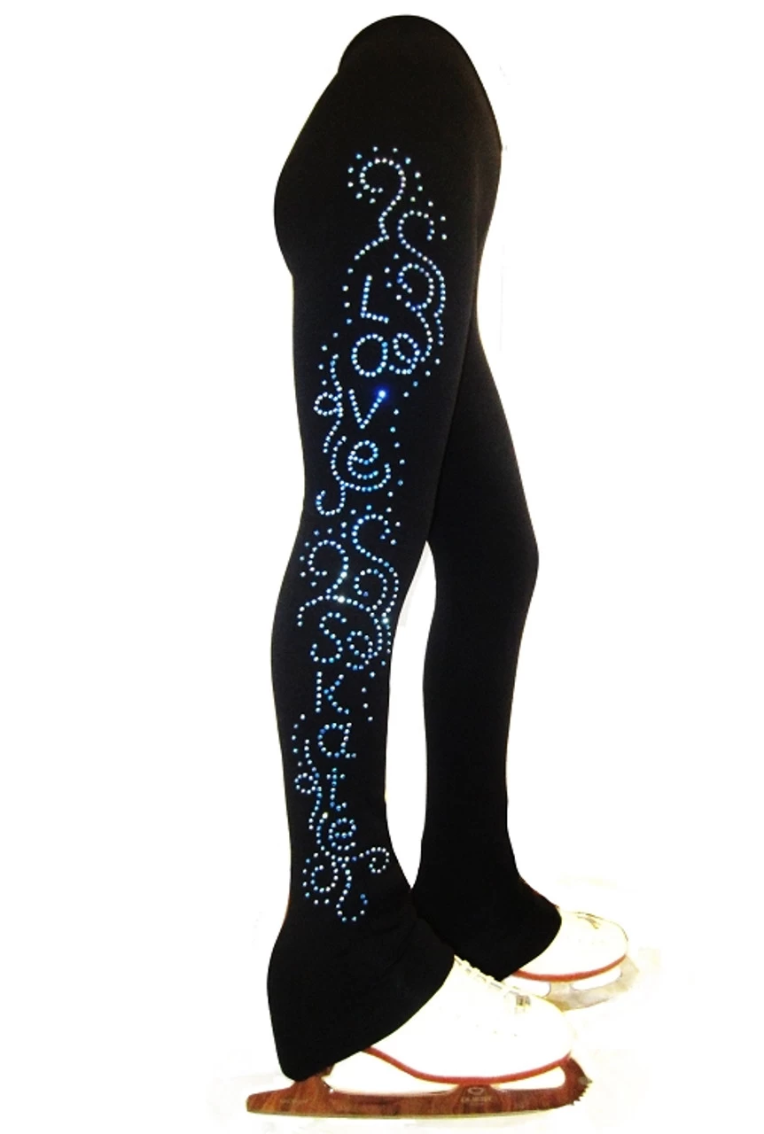 Polartec power stretch ice skating pants with AB Sapphire ( blue) “Love and Skate with ornament” rhinestones applique.