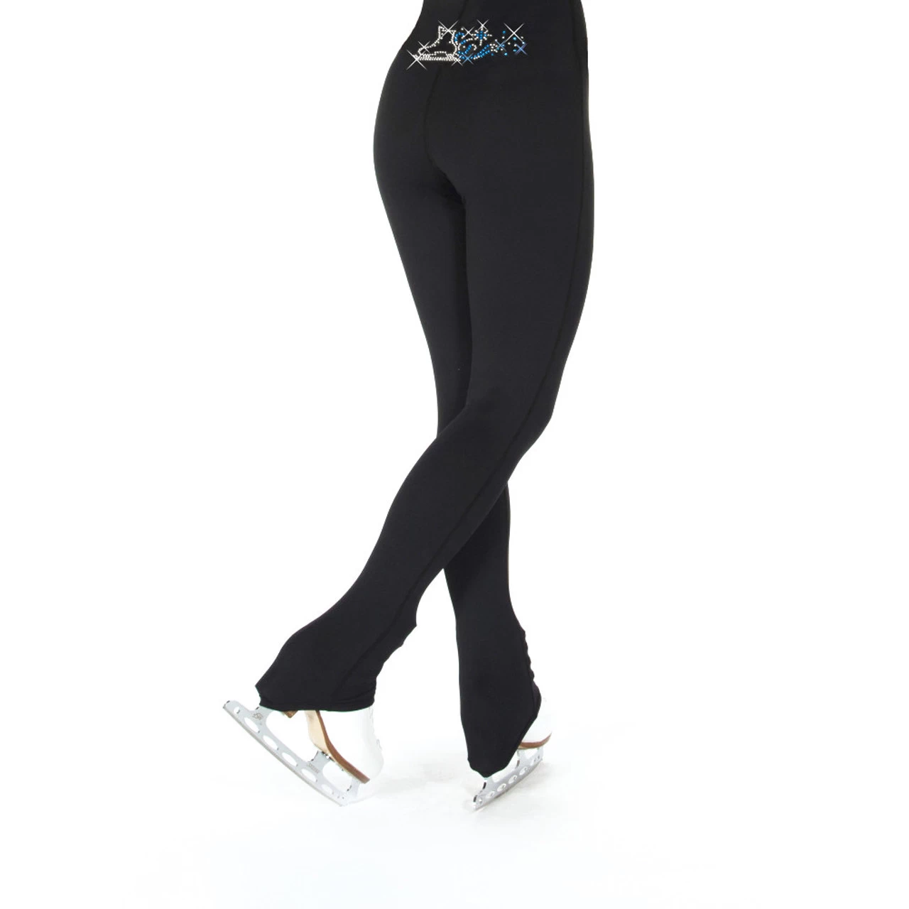 Swooshing crystal skate design with blue and silver crystal snowflakes following along the back waist. This style is a heel pant made of warm fleece.