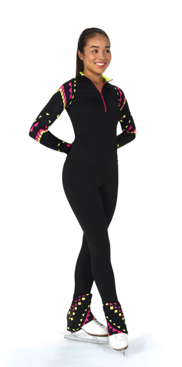 Black supplex top with a contrasting zipper, a pop of colour lining the collar and bright chevron print raglan sleeves.